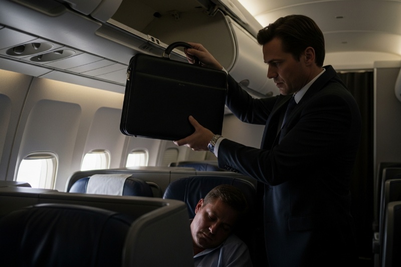 در حالی که مرد تاجر در خواب بود، همسرش پس از یک چرت کوتاه بیدار شد و صحنهای عجیب را دید. او لیو را مشاهده کرد که به سمت صندلی همسرش رفت، کیف دستی او را از محفظه بالای سر برداشت و با خونسردی آن را به صندلی خودش برد.