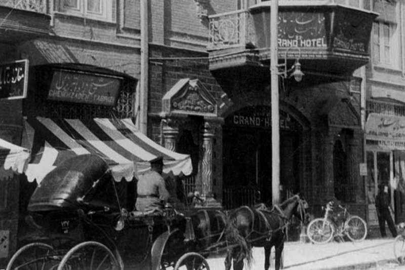 تصویر تاریخی از گراند هتل تهران، نمایانگر همزیستی کالسکههای اسبی و نخستین خودروهای شخصی در ابتدای راه دروازههای مدرن پایتخت است.