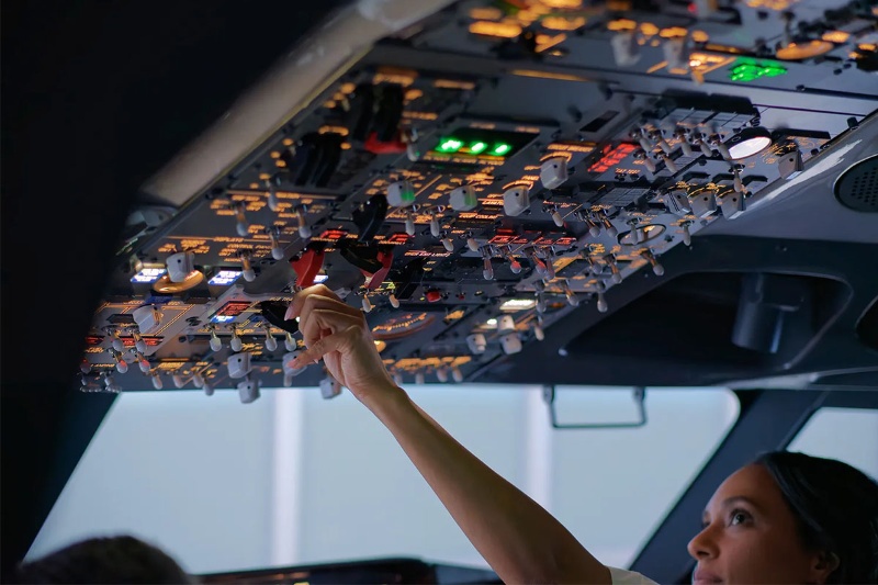 یک خلبان زن در حال تنظیم  یک کلید یا اهرم