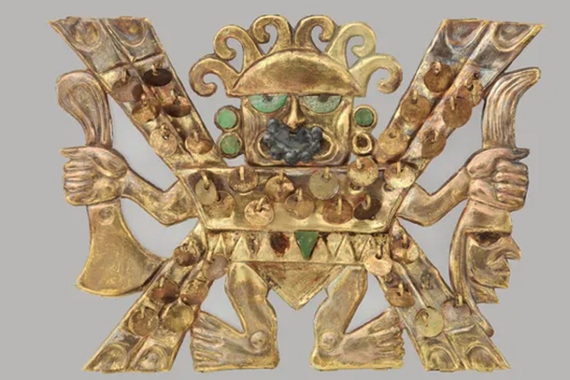 یک زینت بینی باستانی با روکش طلا، چهره خدای خونخوار «سَر بُرنده» را به تصویر میکشد.