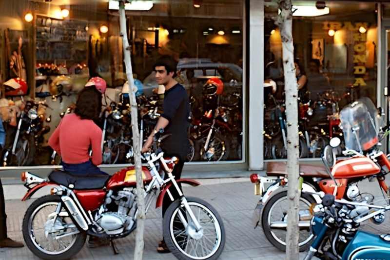 نمایی از یک موتورفروشی در تهران دهه ۵۰ که سرگذشت جوانان شهری را در آن زمان بازتاب میدهد.