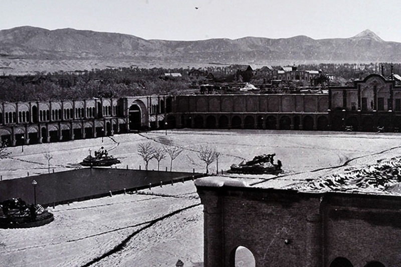 میدان توپخانه تهران زیر برف زمستانی در دوره قاجار ثبت شده است.