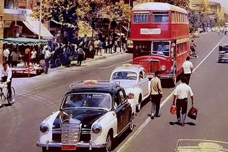 عکسی تاریخی خیابان فردوسی تهران مسافران را سوار بر اتوبوسهای دوطبقه قرمز محبوب آن روزگار نشان میدهد.
