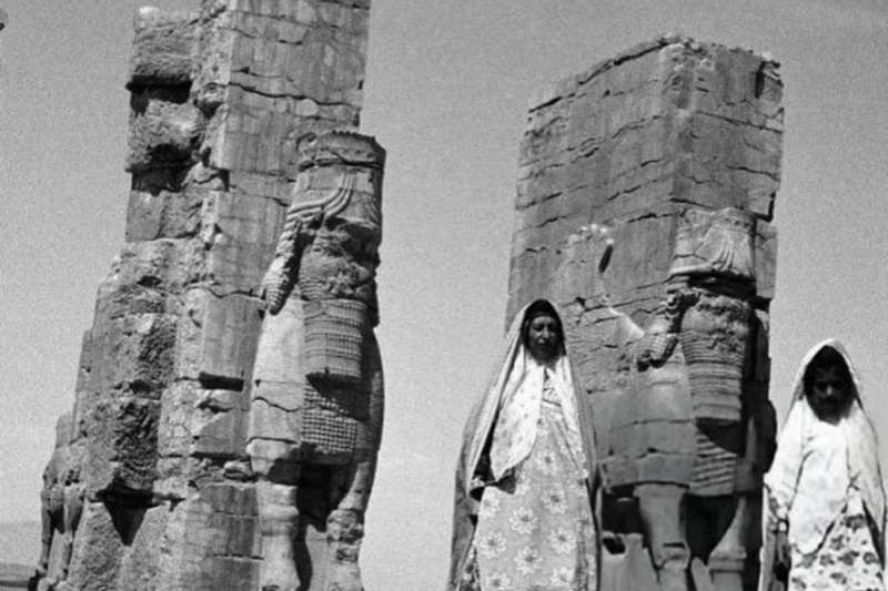 این عکس تاریخی ارزشمند زنان ایرانی عشایر با لباسهای محلی را در مقابل دروازه ملل تخت جمشید نشان میدهد.