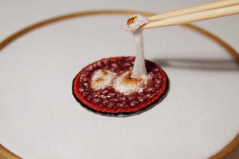 «ایپنوت» (Ipnot)، هنرمند بااستعداد ژاپنی، دنیای گلدوزی را با مهارت شگفتانگیز خود در بازآفرینی غذاها بهصورت مینیاتوری و پارچهای، دگرگون کرده است. آثار او همچون رنگینکمانی از رنگها و بافتها است که با استفاده از ۵۰۰ نوع نخ مختلف، با دقتی خیرهکننده خلق شدهاند. هر قطعه، جلوهای از وسواس هنرمندانهای است که بیننده را نه فقط به تحسین هنر، بلکه به هوس خوردن خوراکیهایی وا میدارد که الهامبخش آن بودهاند. از رولهای سوشی گرفته تا برشهای میوه، هر اثر او، با وجود مقیاس بسیار کوچک، چنان واقعگرایانه است که بیننده را در مرز خیال و واقعیت نگه میدارد.
