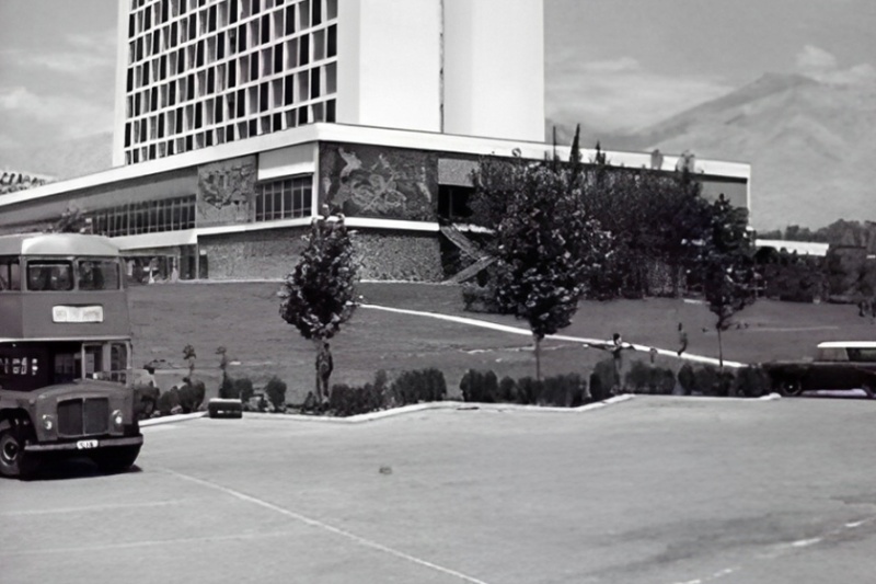 در این عکس تاریخی نمایی از هتل هیلتون تهران دیده میشود، همچنین یکی از اتوبوس دو طبقههای معروف شهر تهران نیز در این عکس حضور دارد.